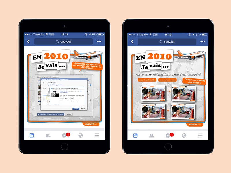 Facebook campaign for Easyjet. Choose your next trip, take a selfie and send personalized virtual postcards to your friends from Facebook.